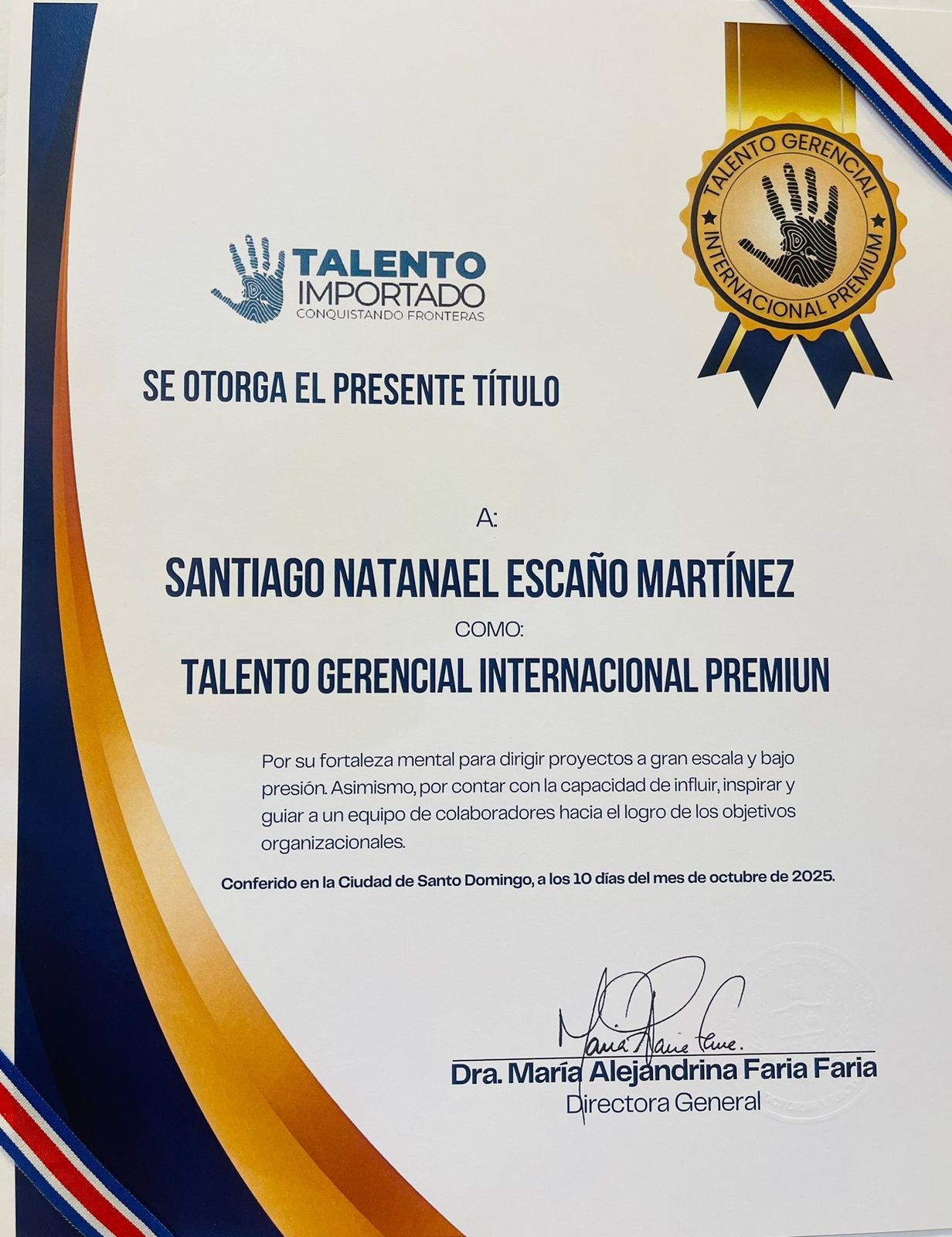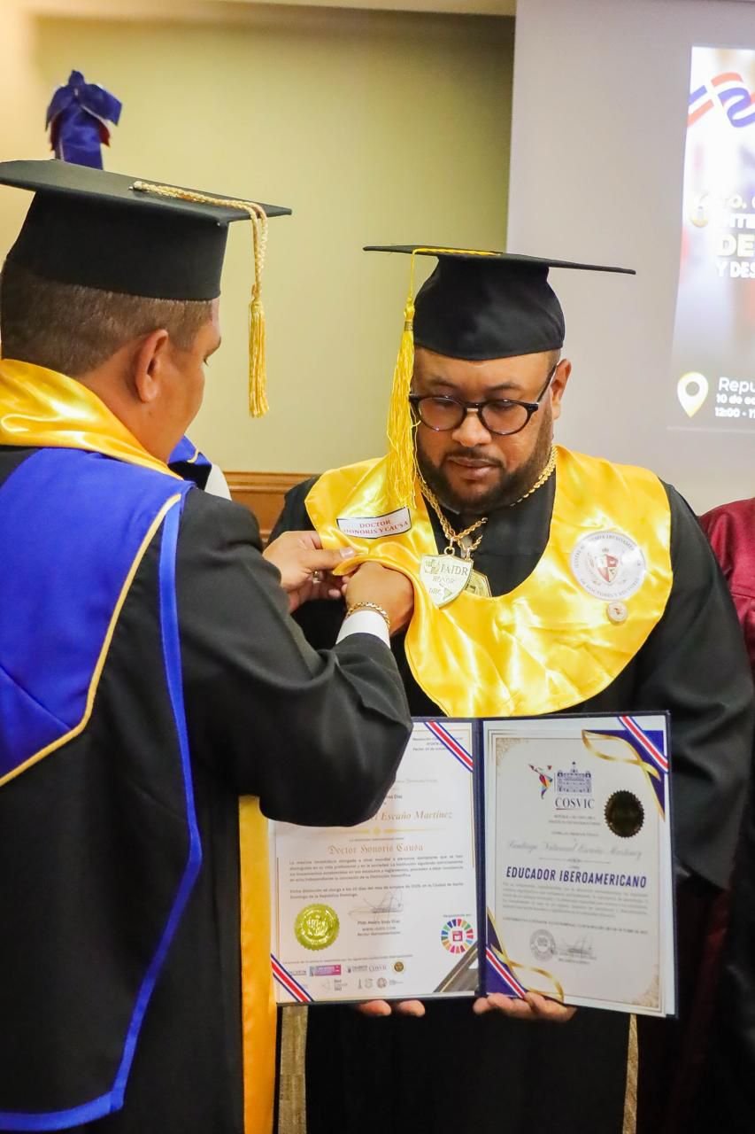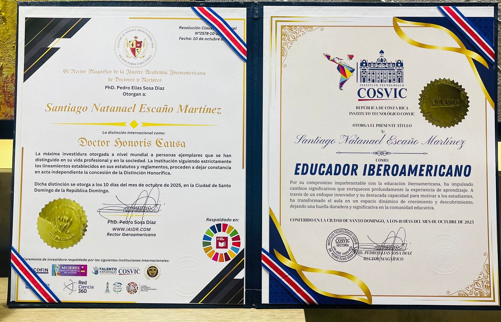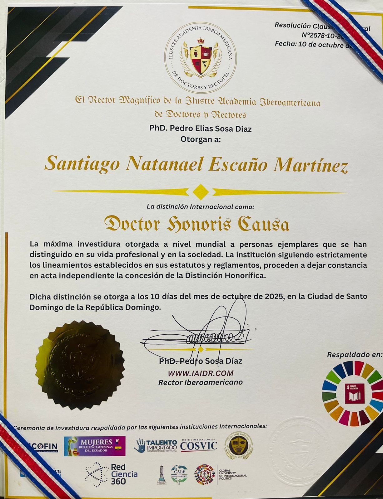 En una ceremonia solemne celebrada en la Ciudad de Santo Domingo, la Ilustre Academia Iberoamericana de Doctores y Rectores (IAIDR) otorgó a Santiago Natanael Escaño Martínez la distinción internacional “Doctor Honoris Causa”, la máxima investidura académica que se concede a nivel mundial a personas cuya trayectoria profesional y social destaca por su excelencia, compromiso y ejemplo para la comunidad global.