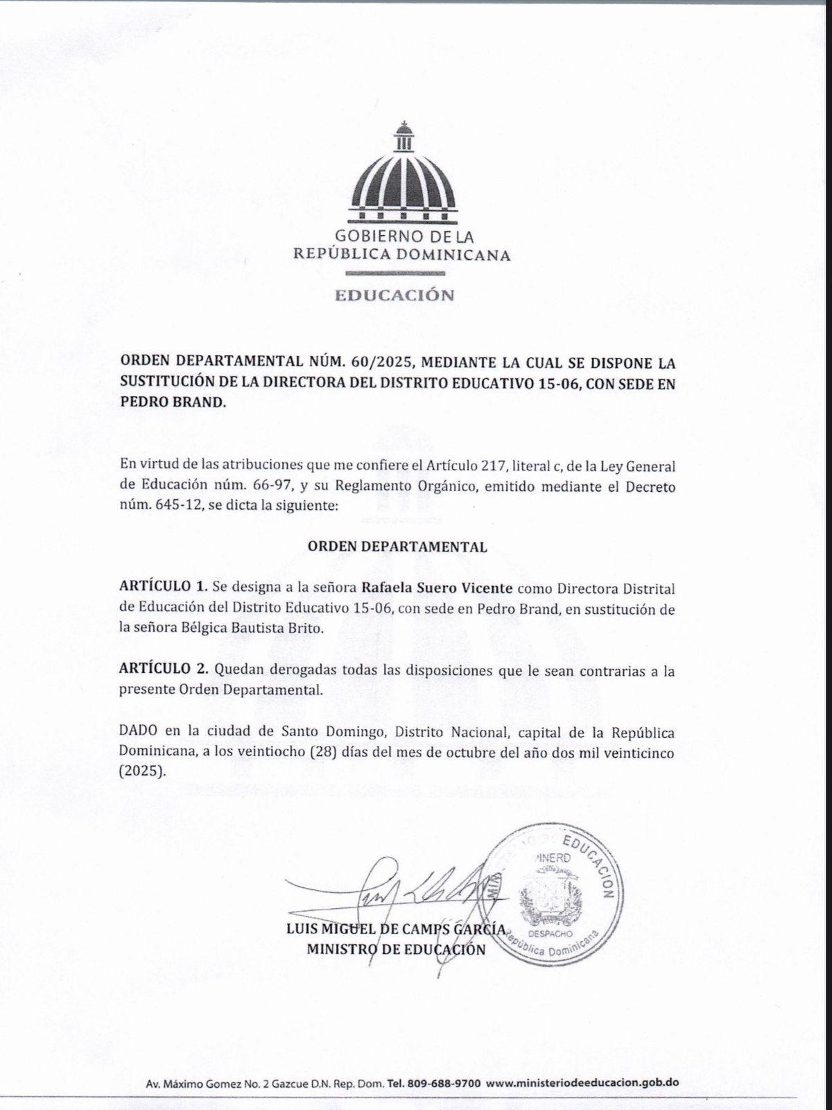 Si nos fijamos bien, la orden departamental # 60/2025, fue emitida y firmada por el Ministro de Educación LUIS MIGUEL DE CAMPS GARCÍA, y es hoy que se da a conocer dicha orden. Lo que nos lleva a una series interrogantes.