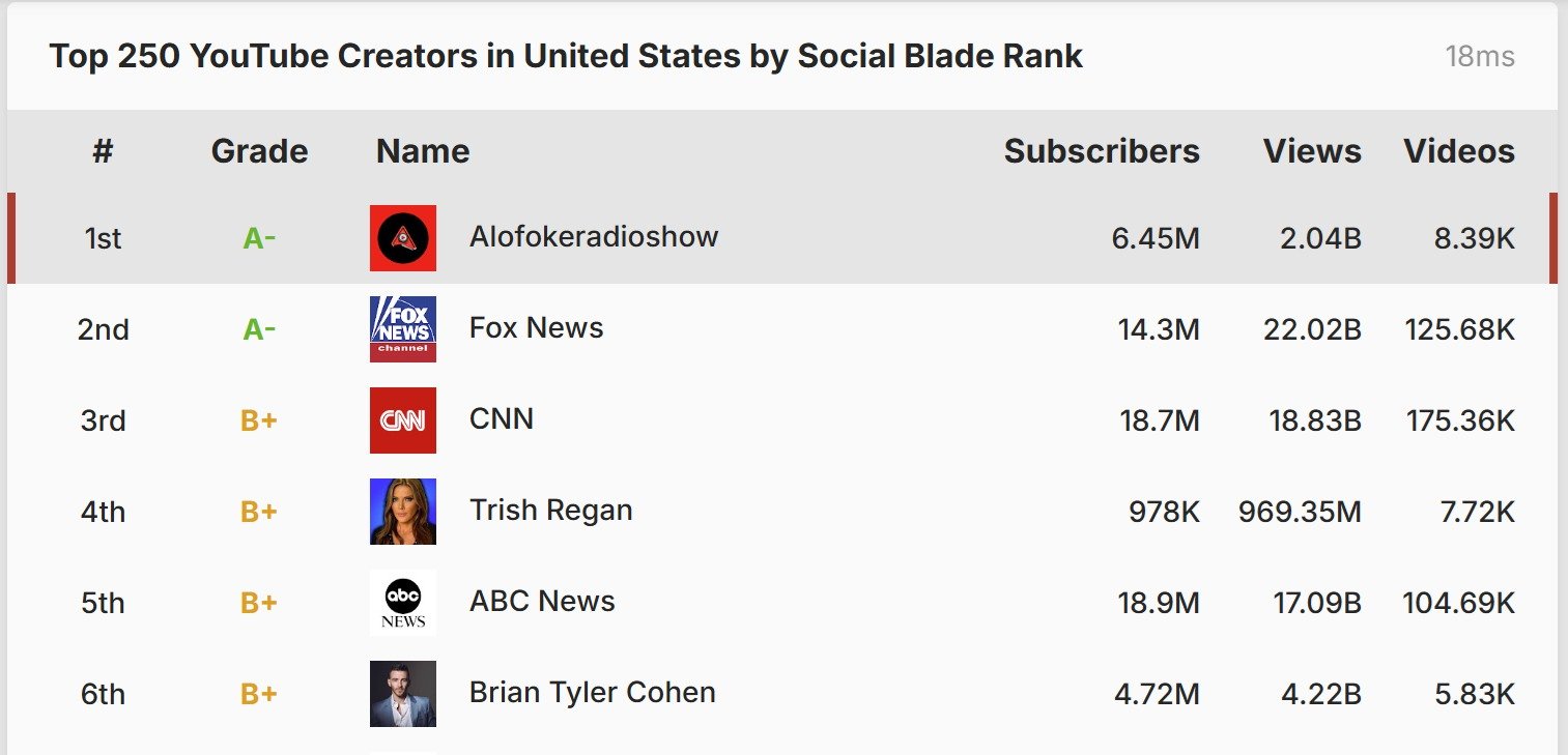 SANTO DOMINGO, RD.- Ya está confirmado, ocurrió lo impensable. @Alofokeradioshow, un canal nacido en Santo Domingo, alcanzó el puesto #1 en el ranking “Top 250 YouTube Creators in United States – News”, superando a Fox News (#2) y CNN (#3).