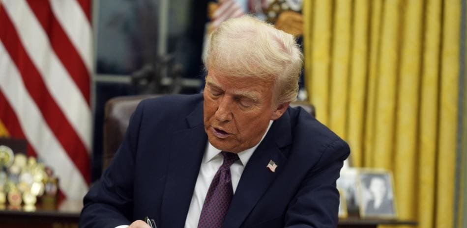 El presidente Donald Trump firma órdenes ejecutivas en el Despacho Oval de la Casa Blanca, el lunes 20 de enero de 2025, en Washington.