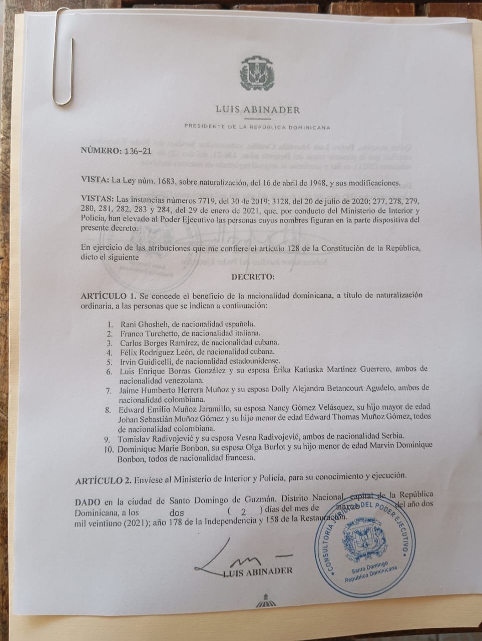 El ascenso de Pérez Florian a general fue divulgado en el año 2021 a través de las redes sociales, bajo un supuesto decreto 136-21. Sin embargo, la oficina del Consultor Jurídico del Poder Ejecutivo ha emitido una certificación que aclara que el *Decreto 136-21 corresponde a la naturalización de ciudadanos extranjeros, no a un nombramiento o ascenso dentro del cuerpo de bomberos.