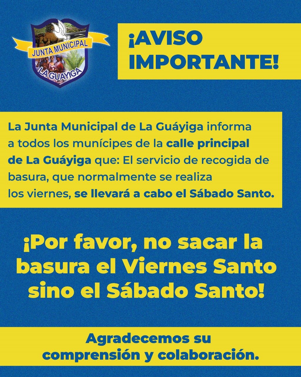 LA GUAYIGA, RD.- La alcaldía del Distrito Municipal de la Guayiga, anuncia a todos sus munícipes el cambio de horario para la recogida de desperdicios sólidos para este sábado santo.