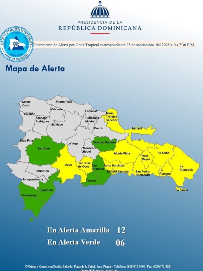 Mientras que bajo alerta verde están Barahona, Peravia, Pedernales, San Juan, San José de Ocoa, San Cristóbal y Sánchez Ramírez.