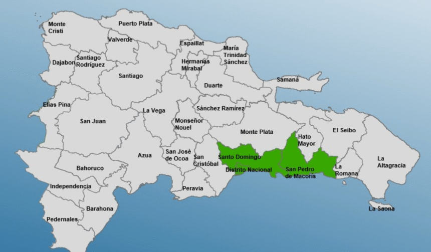 La medida preventiva abarca al Distrito Nacional, la provincia Santo Domingo y San Pedro de Macorís, zonas donde se esperan aguaceros locales con tronadas aisladas y ráfagas de viento, según los pronósticos.