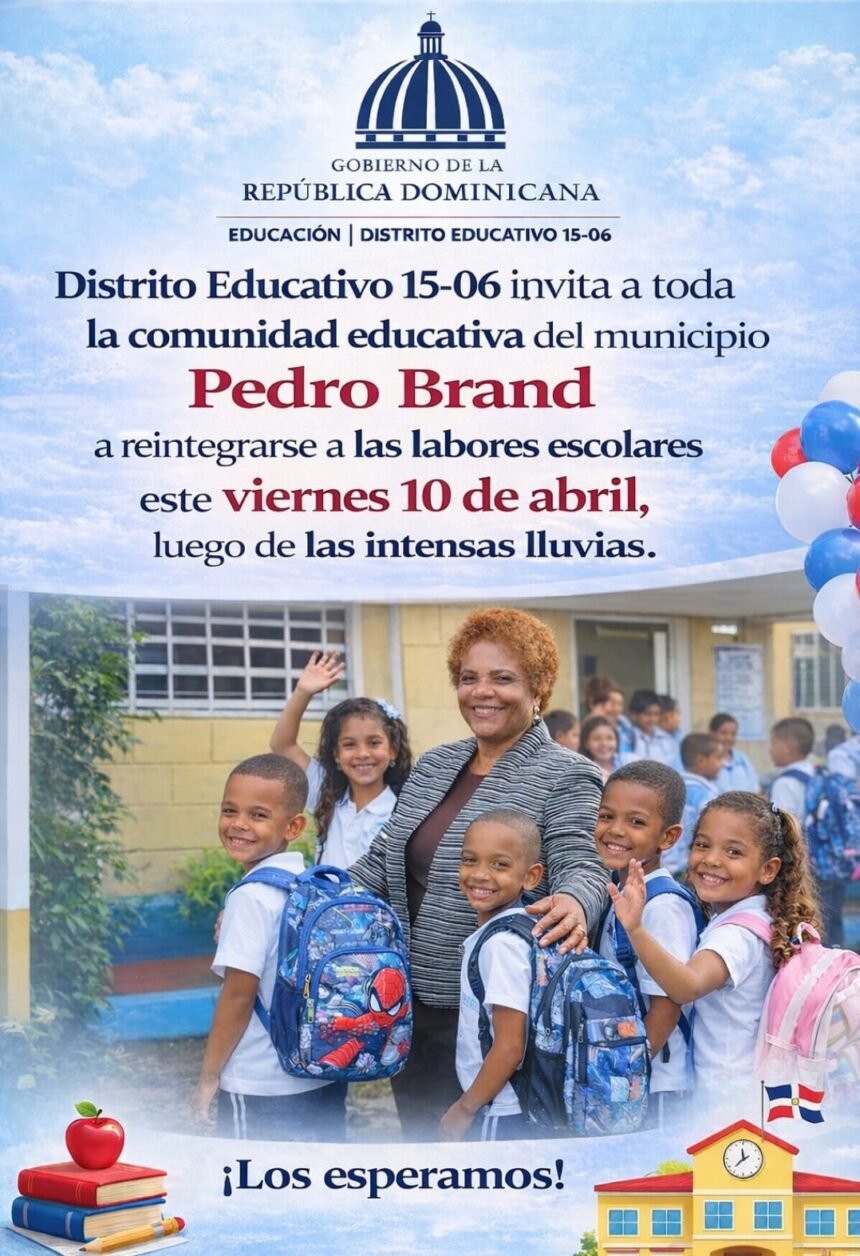 PEDRO BRAND, RD.- El Distrito Educativo 15-06 invita a toda la comunidad educativa del municipio de Pedro Brand a reintegrarse a las labores escolares este viernes 10 de abril, luego de las intensas lluvias registradas en los últimos días.