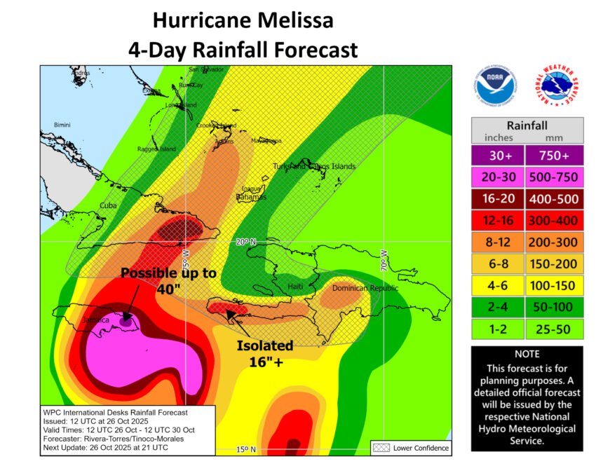 Melissa podría descargar hasta un total de 380 a 760 milímetros de lluvia, con posibilidades de más de 1.000 milímetros en localidades del sur de la Española y Jamaica hasta el miércoles, y entre 152 y 304 milímetros en el sureste cubano, según el NHC, que advierte sobre fuertes precipitaciones adicionales a lo largo de la semana.