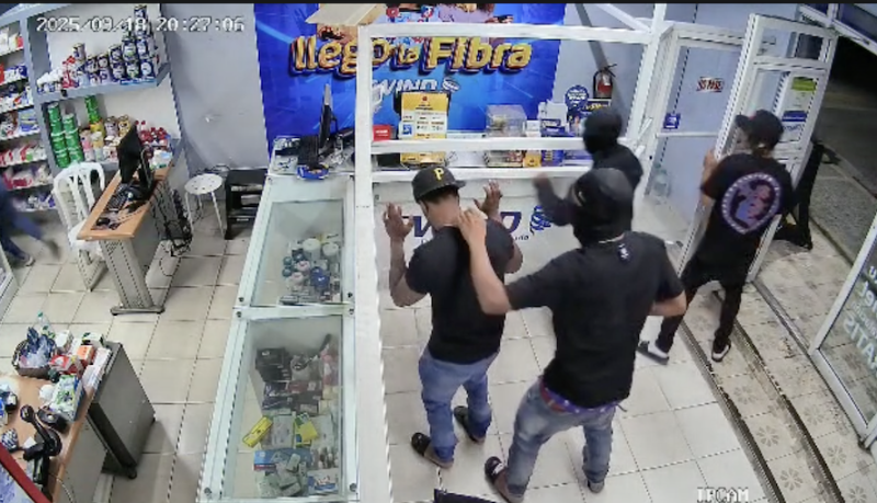 Una cámara de vigilancia captó el momento del atraco a cargo de un grupo de delincuentes a la farmacia Las Tres Rosas, en Paya, Baní.