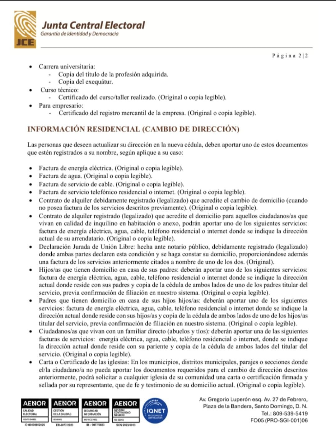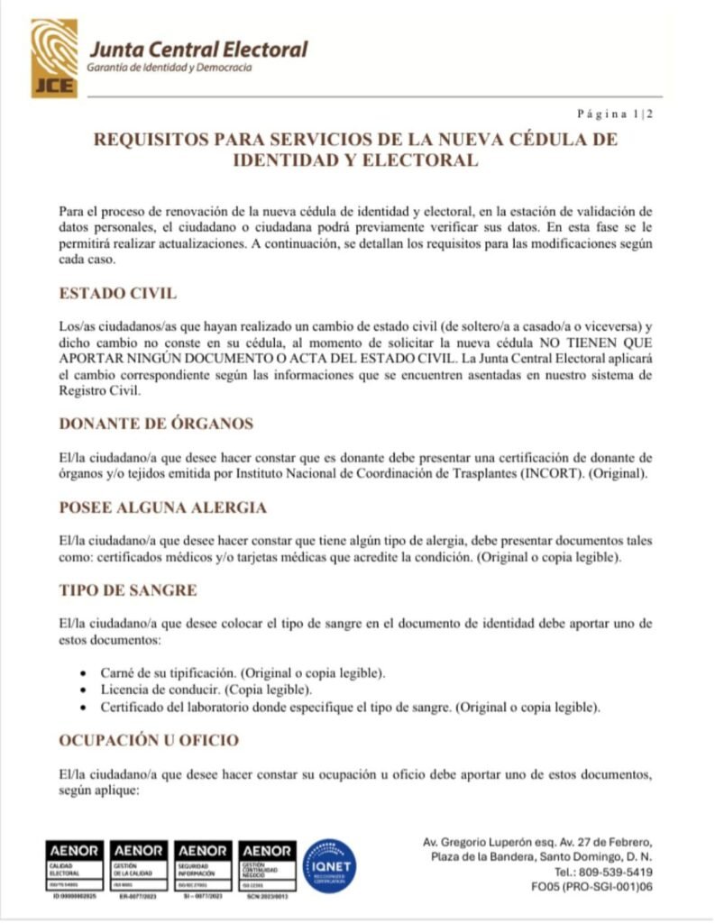 SANTO DOMINGO, RD.- La Junta Central Electoral (JCE) dio a conocer este sábado los requisitos para acceder a los servicios relacionados con la nueva cédula de identidad y electoral, en el marco del proceso de modernización del sistema de identificación nacional.