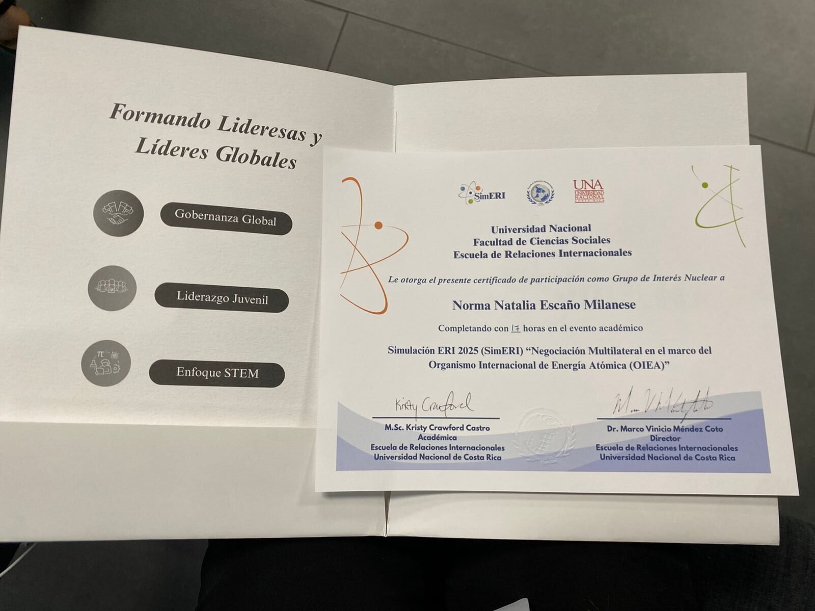 Esta joven, es un orgullo para sus padres, los Lic. SANTIAGO NATANAEL ESCAÑO y la Licda. SAMIRA MILANESE DE ESCAÑO, que hoy rebozan de orgullo al ver a su retoño participando en la «Negociación Multilateral de Energía Atómica»
