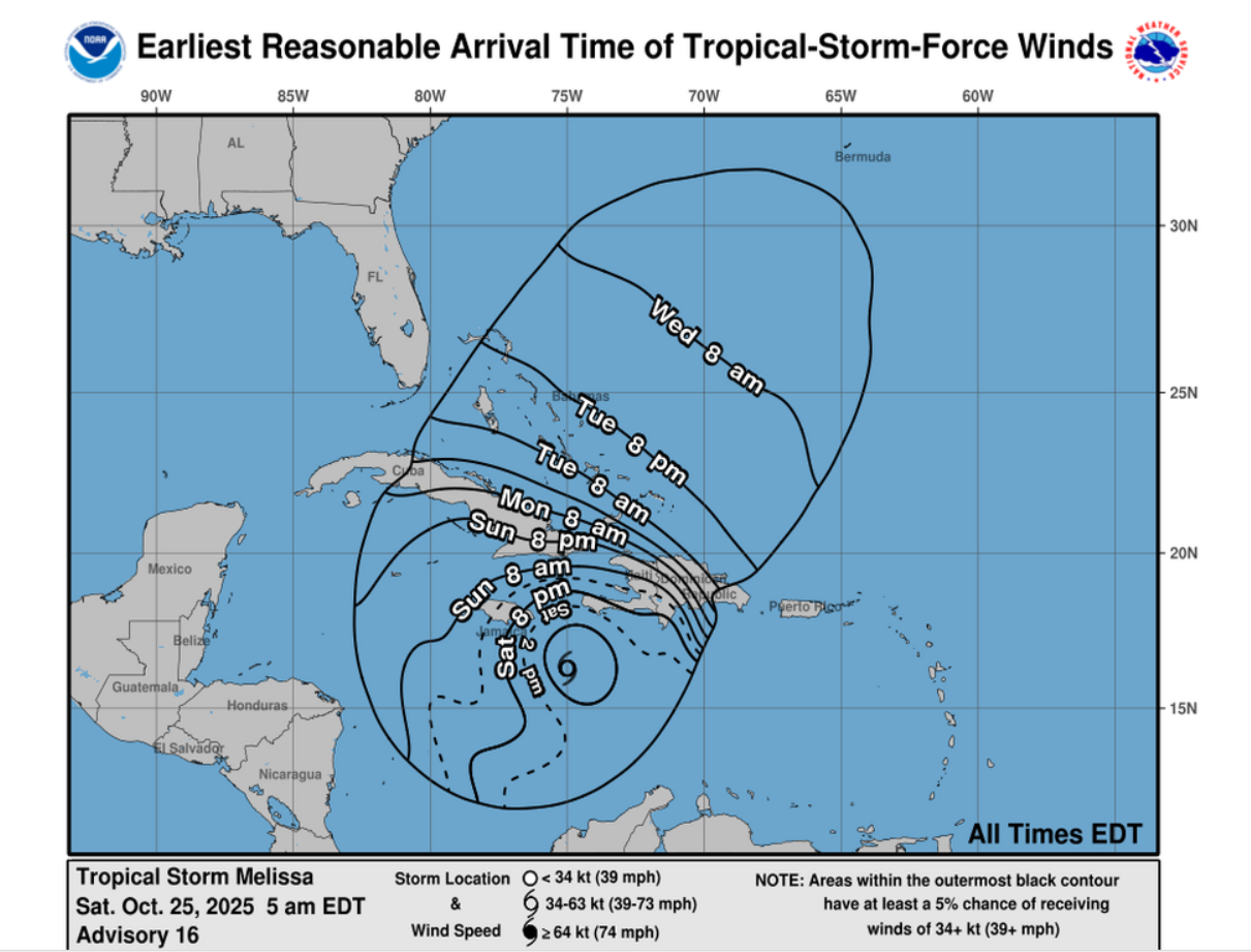 El lento movimiento de Melissa traerá un período de varios días de vientos dañinos y fuertes lluvias a partir de esta noche, probablemente causando inundaciones repentinas catastróficas y numerosos deslizamientos de tierra, según advierte el NHC.