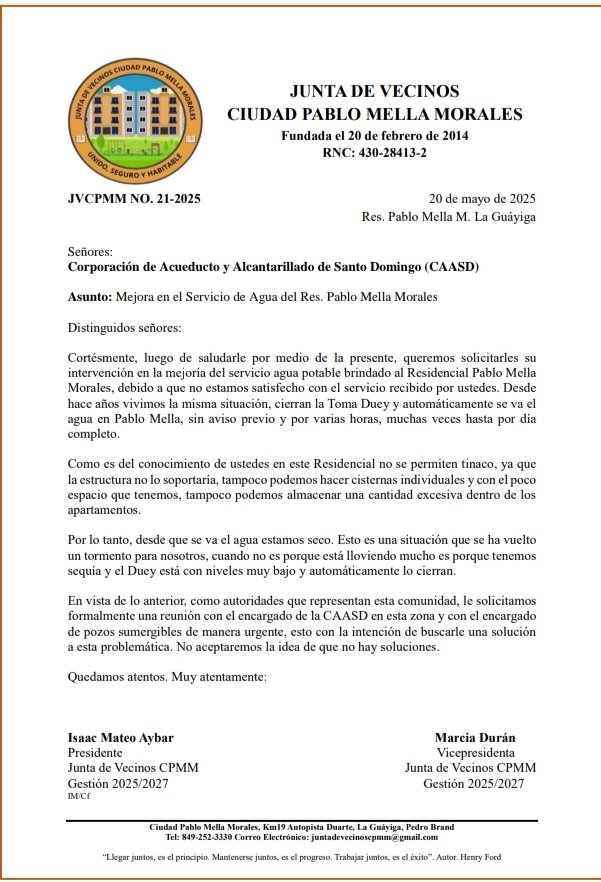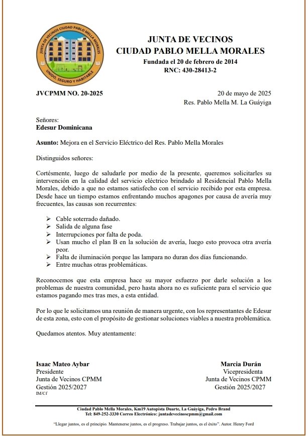 Tras los problemas que vienen teniendo con la energía eléctrica, una comisión de los directivos se presentó a la Corporación de Acueducto de SANTO DOMINGO, y depósito una comunicación pidiendo se resuelva el mal que afecta este Residencial.