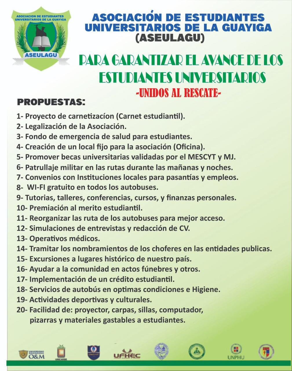 Esta nueva propuesta a dirigir los destinos de la Asociación de estudiantes de la Guayiga, trae consigo un amplio proyecto para sólo beneficiar a los estudiantes de todo el Distrito Municipal de la Guayiga.