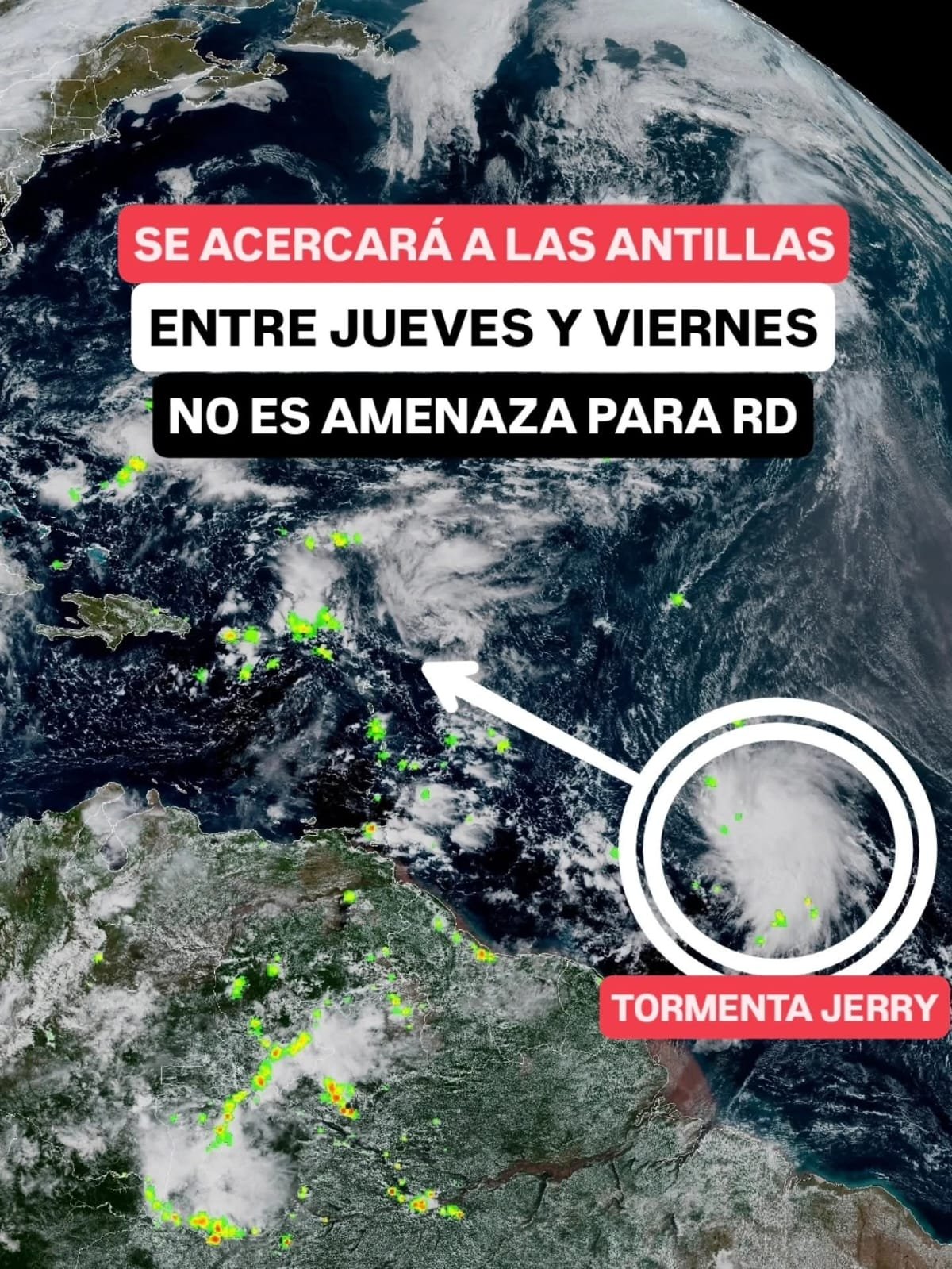 SANTO DOMINGO, RD.- Se ha reactivado la temporada ciclónica en el Atlántico con la formación de la Tormenta Tropical Jerry: actualmente se desplaza hacia el oeste a 39 km/h, con tendencia a moverse hacia el oeste-noroeste desde mañana.
