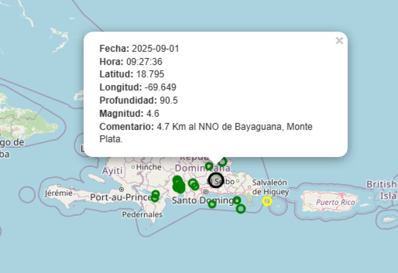 BAYAGUANA, MONTE PLATA, RD.- Aproximadamente a las 5:27 de la mañana de este lunes se registró un temblor de tierra de magnitud 4.6 en Bayaguana, provincia Monte Plata.