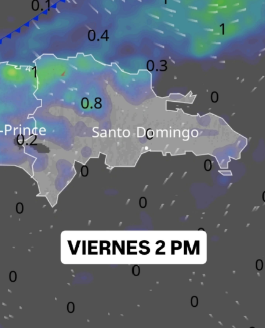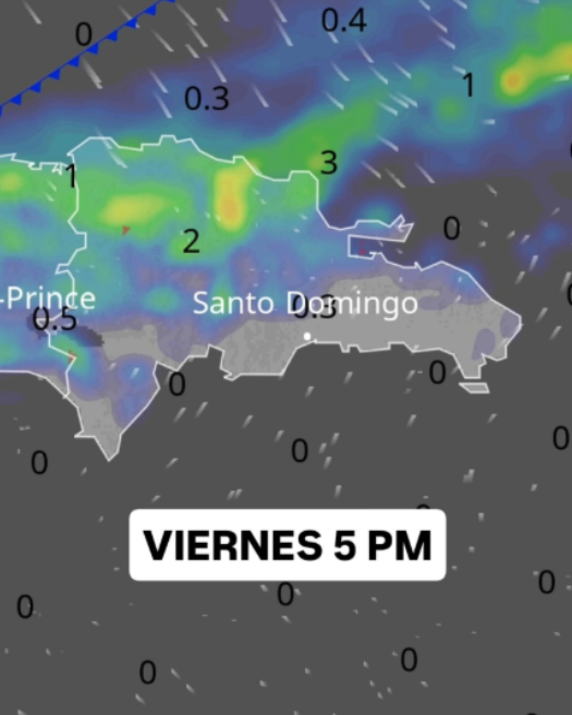 Mañana viernes continuarán los efectos de la vaguada y tendremos la cercanía del frente frío número 25: después del mediodía incrementarán las precipitaciones en gran parte del territorio dominicano, principalmente en el Cibao; ya en la noche, los aguaceros se extenderán hacia el litoral caribeño.