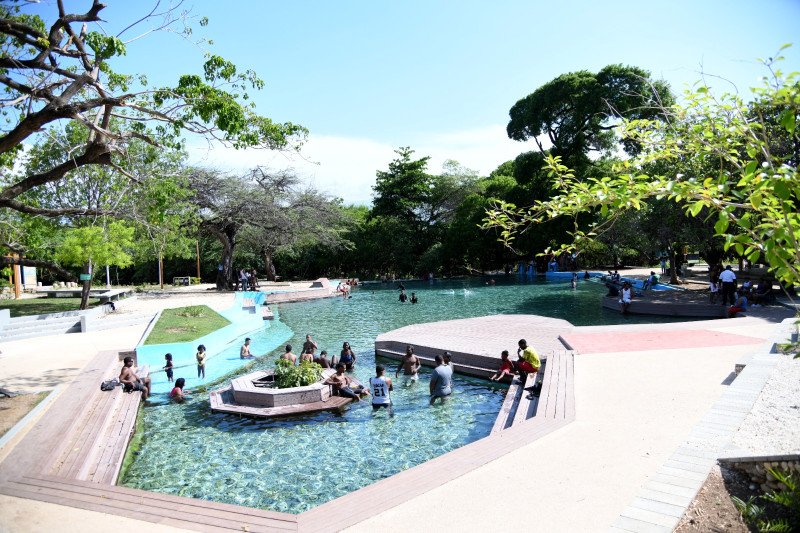 Este entorno cuenta con juegos infantiles, áreas verdes, iluminación, bancos de hormigón, mesas de pícnic y duchas gratuitas, además de escalinatas y rampas para una mejor accesibilidad.