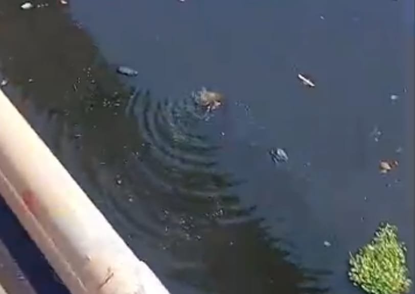 Uno de los motoristas impactado salí volando desde el puente y cayó en el vacío (río), el cual como se observa en el vídeo, lucha por sobrevivir.